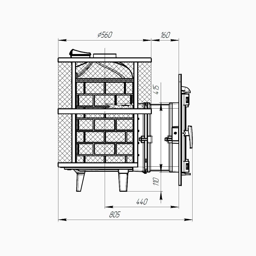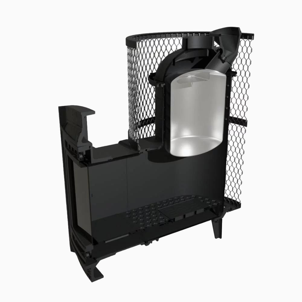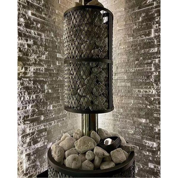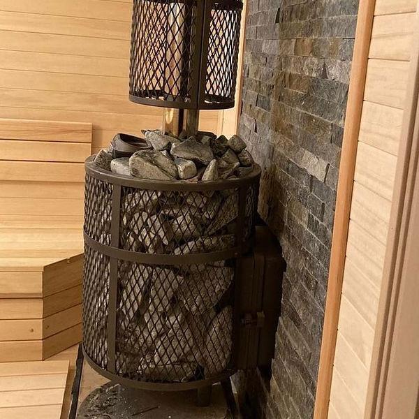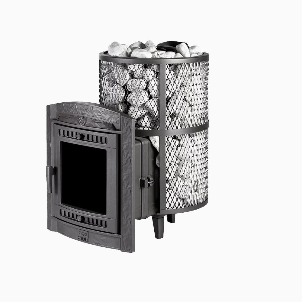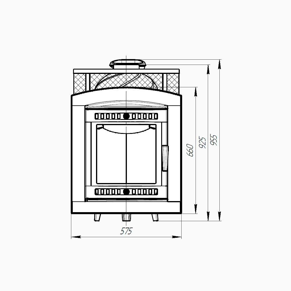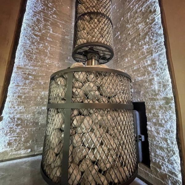 Компактная и экономичная модель с коротким топливным тоннелем. Кожух печи изготовлен в виде сетки из стали и полностью заполняется природными камнями, обеспечивая высокую динамику нагрева парильного помещения.