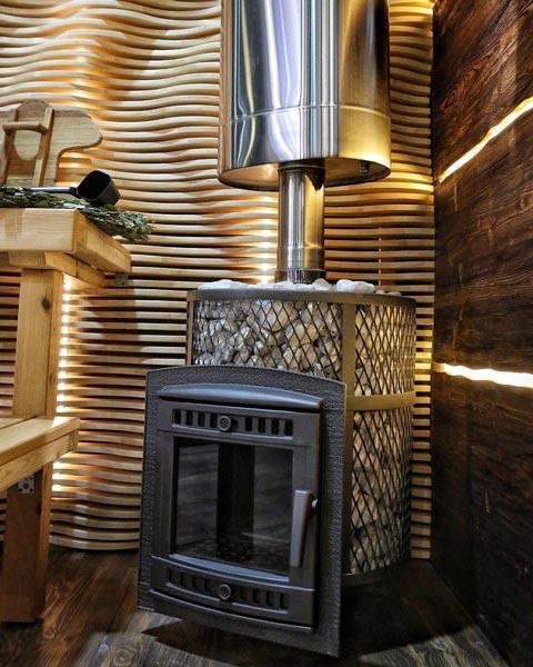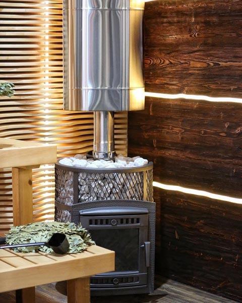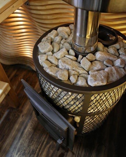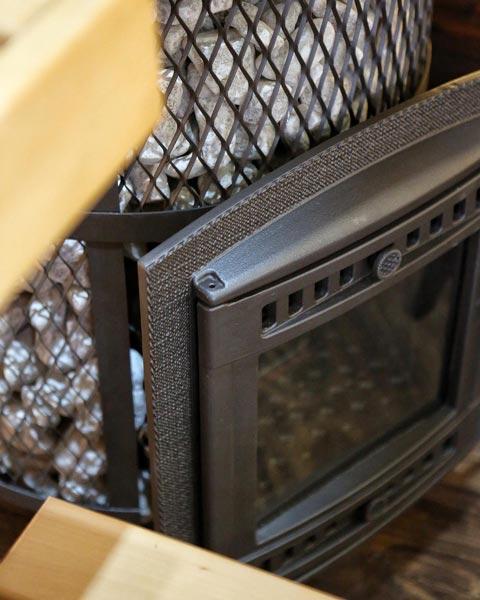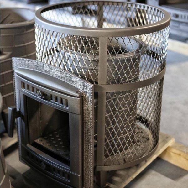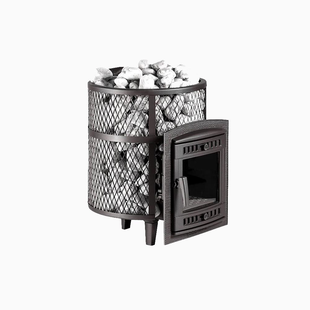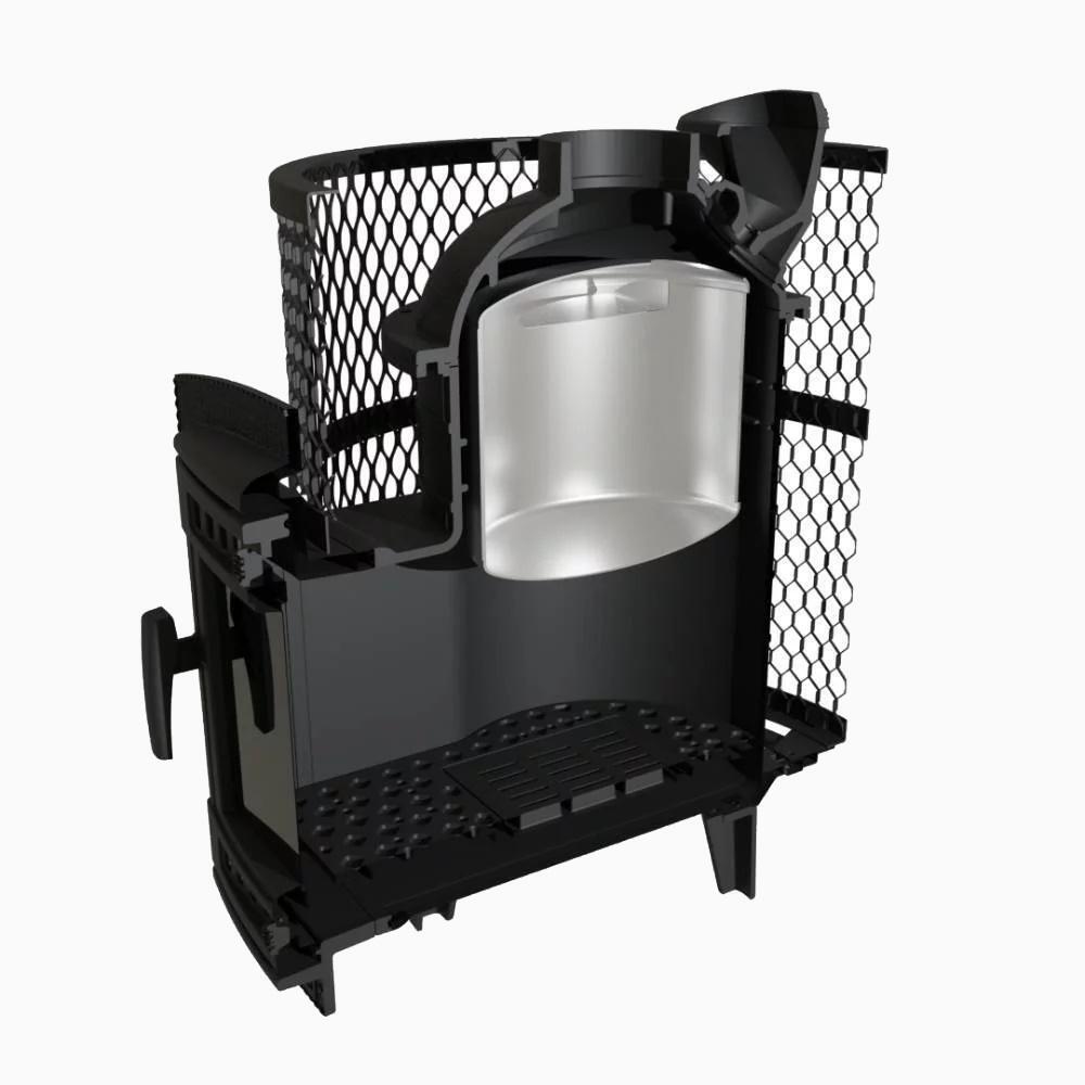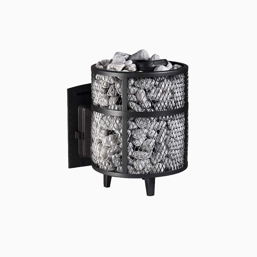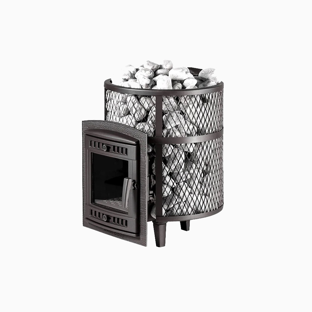 Ультра компактная модель банной печи с коротким топливным тоннелем. Кожух печи изготовлен в виде сетки из нержавеющей стали и полностью заполняется природными камнями, обеспечивая высокую динамику нагрева парильного помещения.