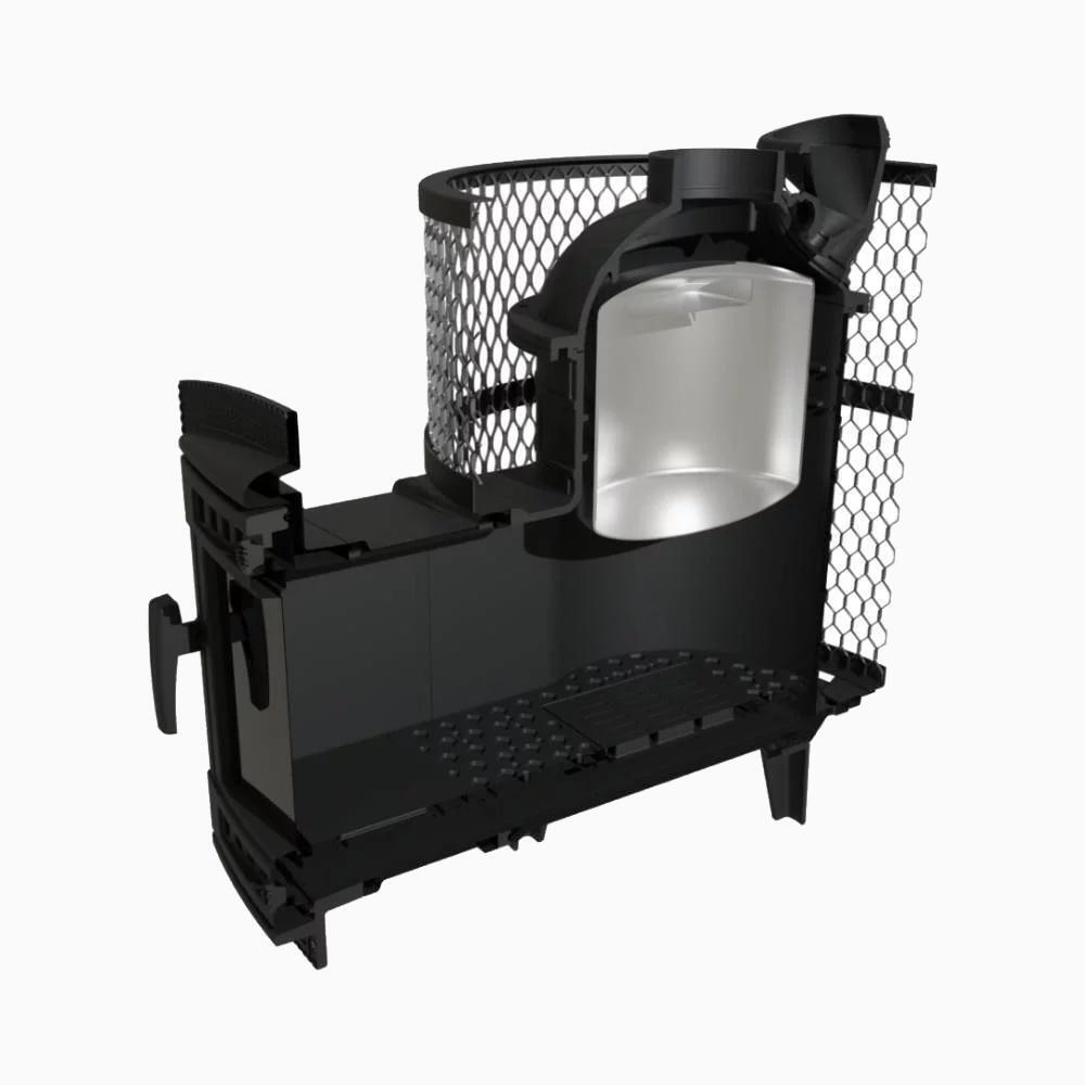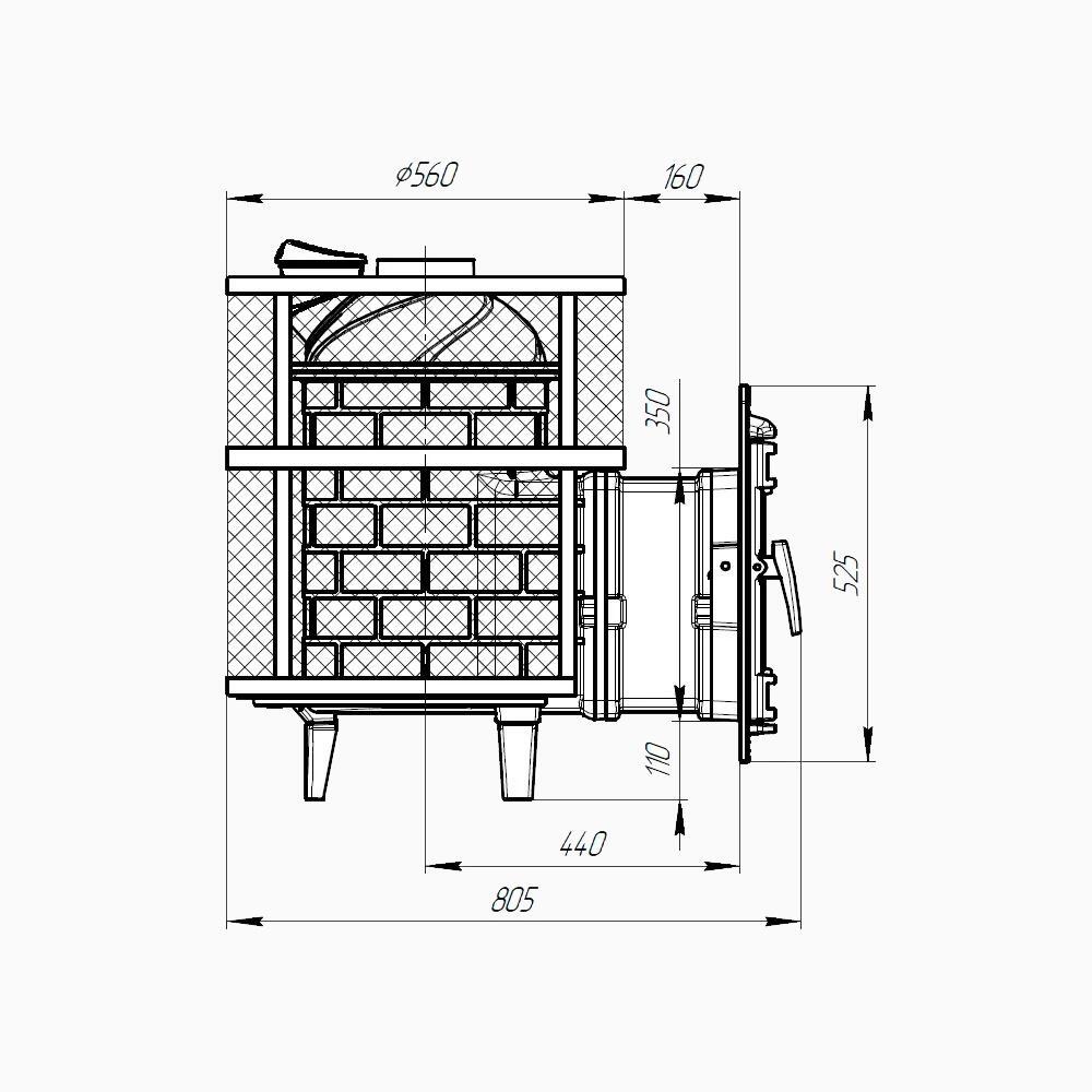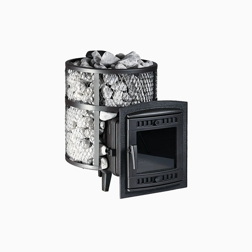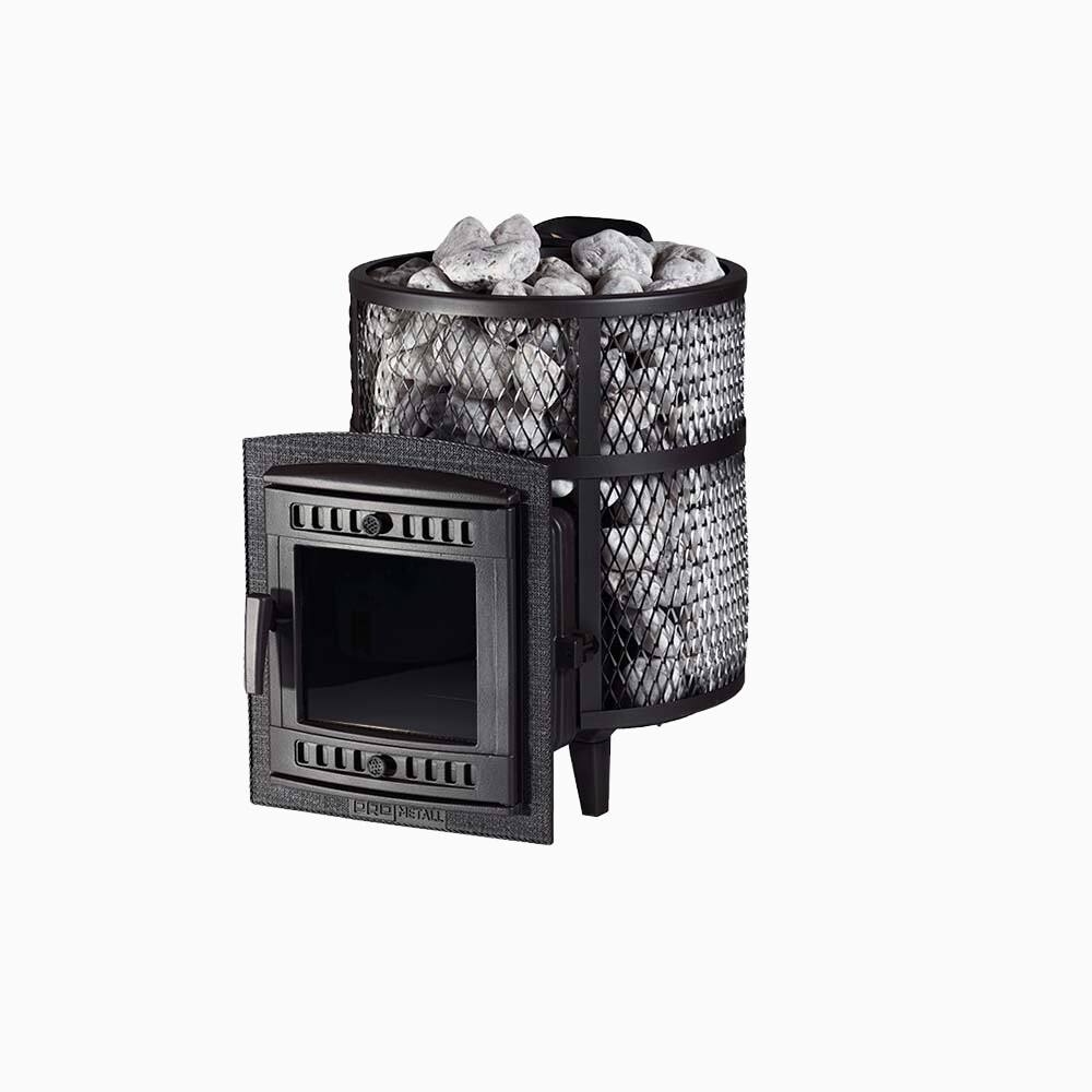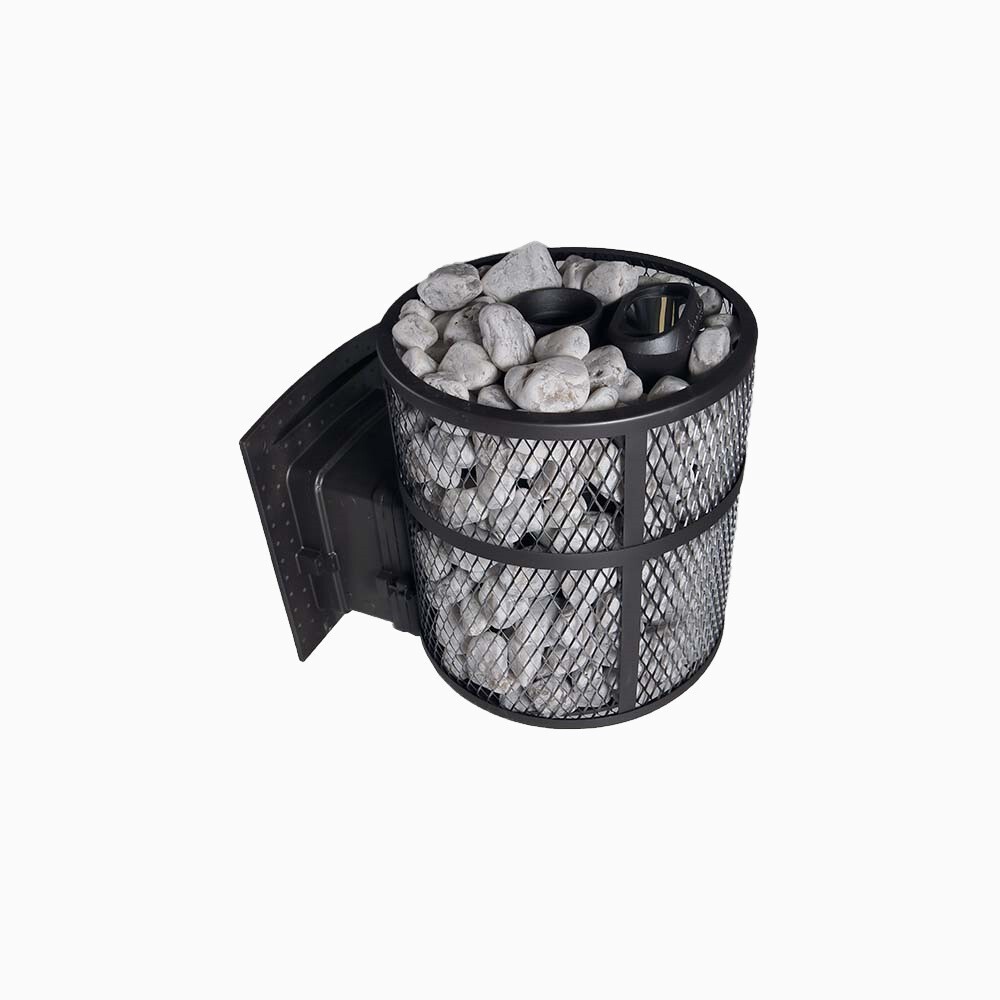 Ультра компактная модель банной печи. Кожух печи изготовлен в виде сетки из нержавеющей стали и полностью заполняется природными камнями, обеспечивая высокую динамику нагрева парильного помещения.