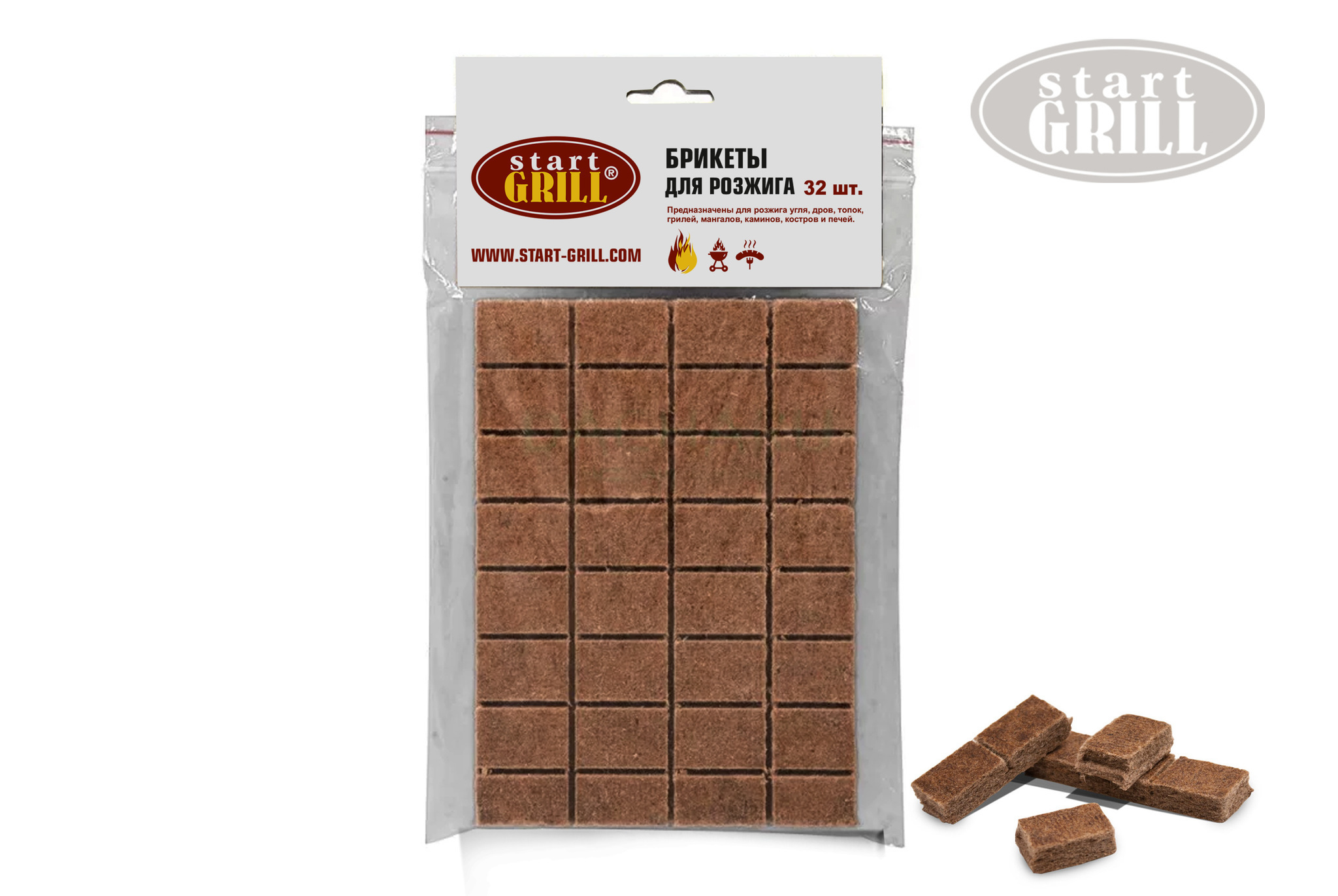 Брикеты для розжига Start Grill, 32 штуки. Предназначены для розжига дров, топок, мангалов, каминов, костров, печей и грилей. Материал: ДВП, Парафин