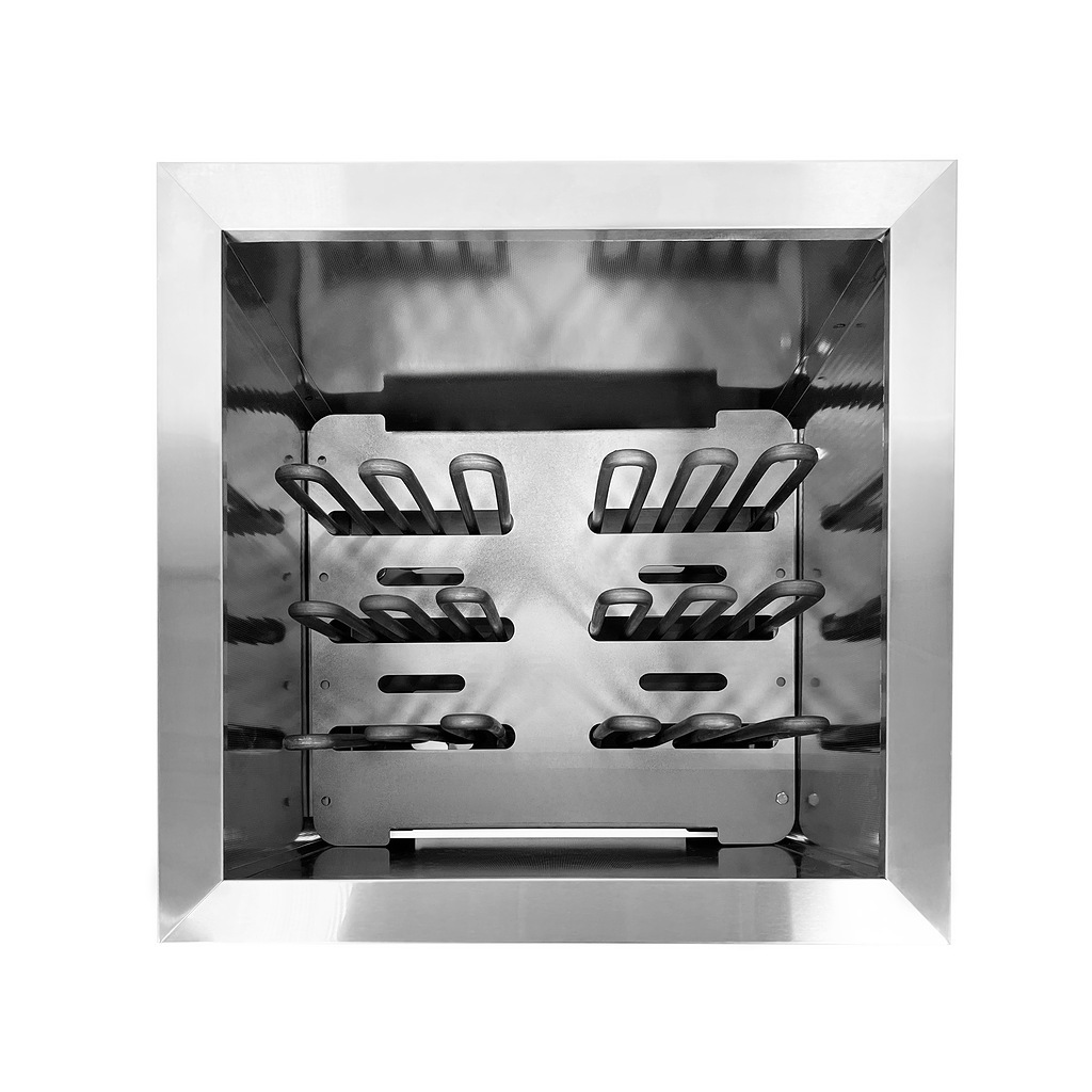 Нагревательным элементом в печке является ТЭН из высококачественной нержавеющей стали. Его диаметр составляет 10 мм. Подобные нагреватели не боятся попадания влаги. Это позволяет устанавливать электрическую каменку как в финские сауны с «сухим» паром, так и в русские традиционные бани с повышенной влажностью, потому что на камни, находящиеся в электропечи можно спокойно лить воду для повышения влажности пара.