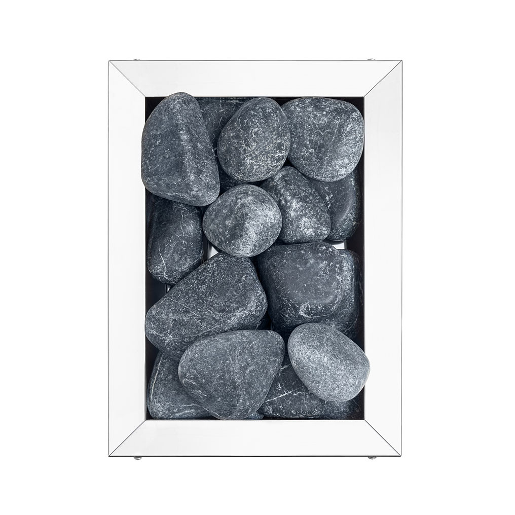 Представленная модель электрокаменки имеет отсек для камней, который вмещает до 50 кг. Она монтируется напольно.