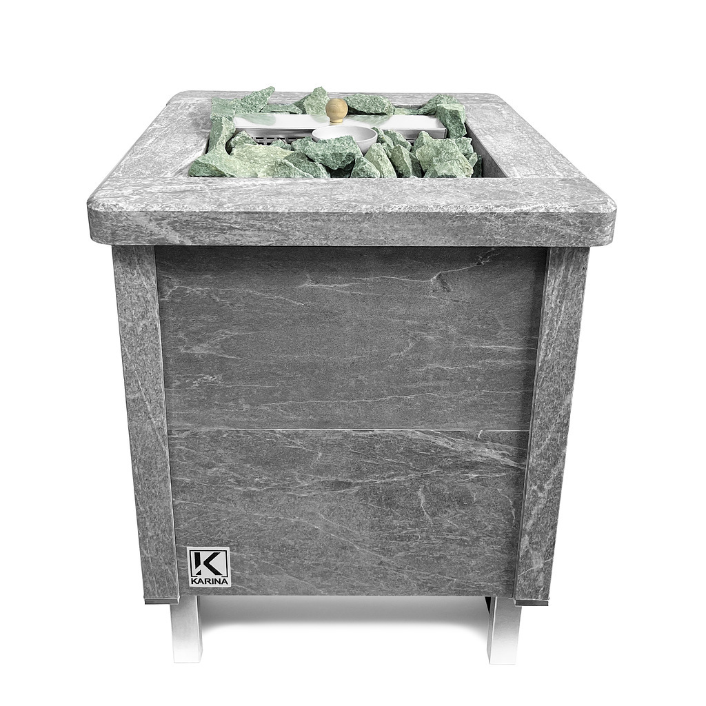 Электрическая печь KARINA Quadro 15 Талькохлорит – это электрокаменка, облицованная натуральным камнем со всех сторон, и обладающая мощностью оптимальной для коммерческих саун объемом до 24 м3.