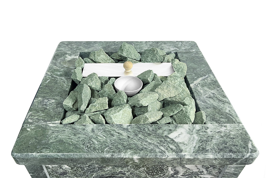 Электрическая каменка со всех сторон облицована натуральным змеевиком. Печь с подобным дизайном стильно смотрится в парильном помещении. Змеевик уже долгие годы используется для внутренней отделки бань. Его называют «аптекарским камнем» за его целебные качества. Минерал оказывает обеззараживающий эффект, положительно влияет на кости, оказывает успокаивающее воздействие и укрепляет иммунитет.