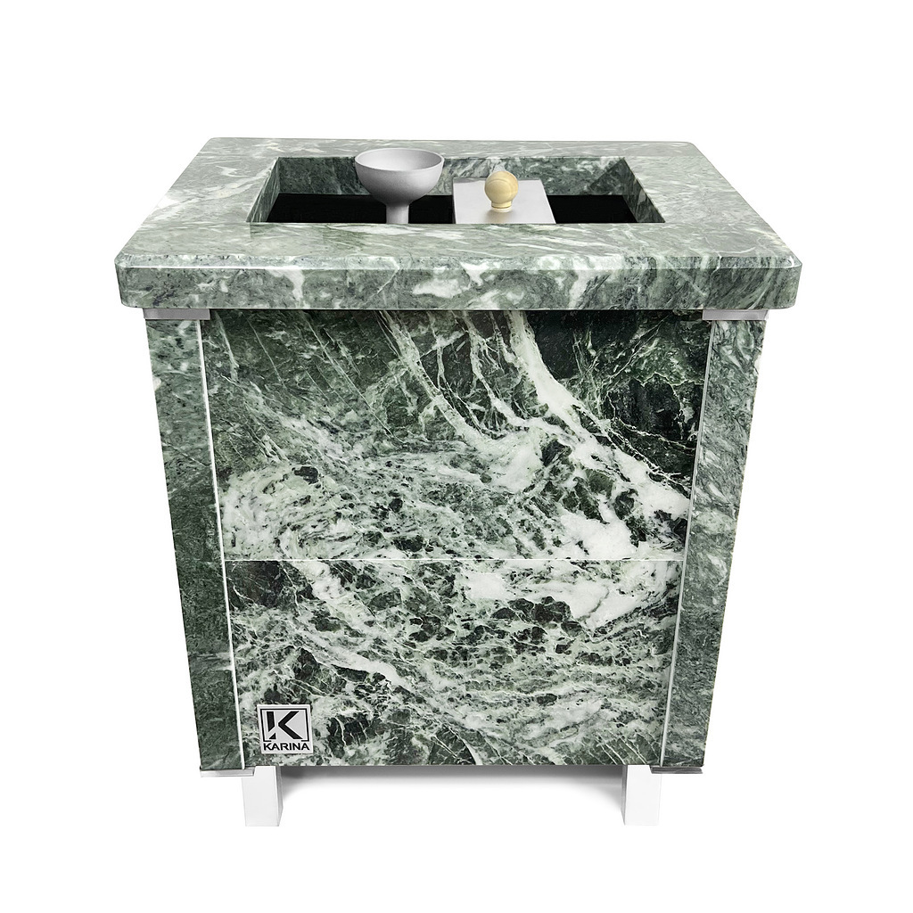 Электрическая каменка со всех сторон облицована натуральным змеевиком. Печь с подобным дизайном стильно смотрится в парильном помещении. Змеевик уже долгие годы используется для внутренней отделки бань. Его называют «аптекарским камнем» за его целебные качества. Минерал оказывает обеззараживающий эффект, положительно влияет на кости, оказывает успокаивающее воздействие и укрепляет иммунитет.