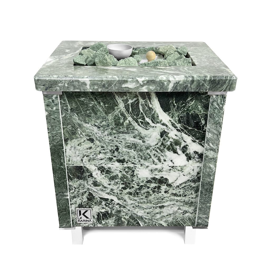 Электрическая печь KARINA Quadro 7,5 Змеевик представляет собой электрокаменку, полностью облицованную натуральным камнем, и способной прогреть семейные бани и сауны объемом до 9 м3.