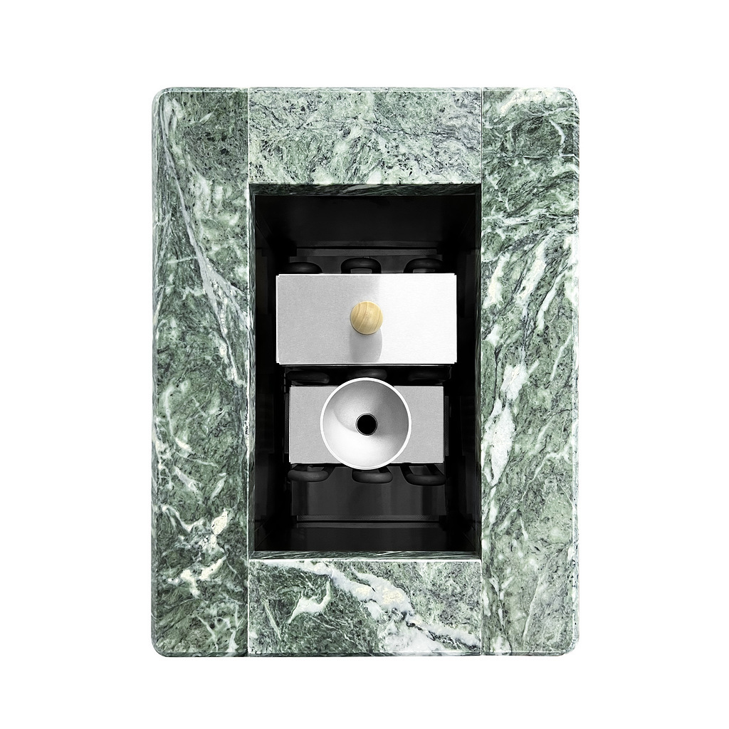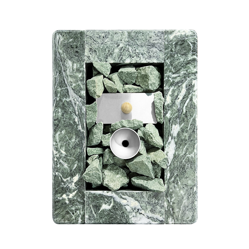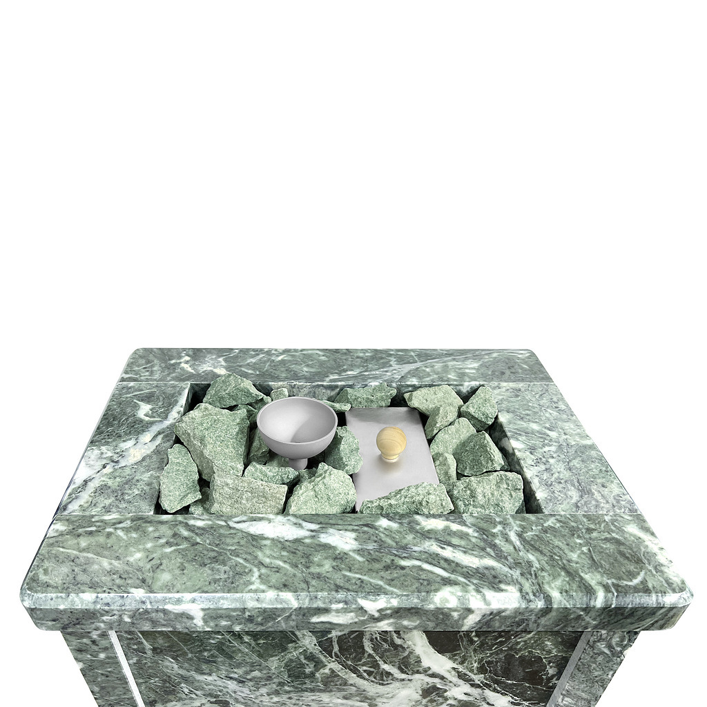 Электрическая каменка со всех сторон облицована натуральным змеевиком. Печь с подобным дизайном стильно смотрится в парильном помещении. Змеевик уже долгие годы используется для внутренней отделки бань. Его называют «аптекарским камнем» за его целебные качества. Минерал оказывает обеззараживающий эффект, положительно влияет на кости, оказывает успокаивающее воздействие и укрепляет иммунитет.