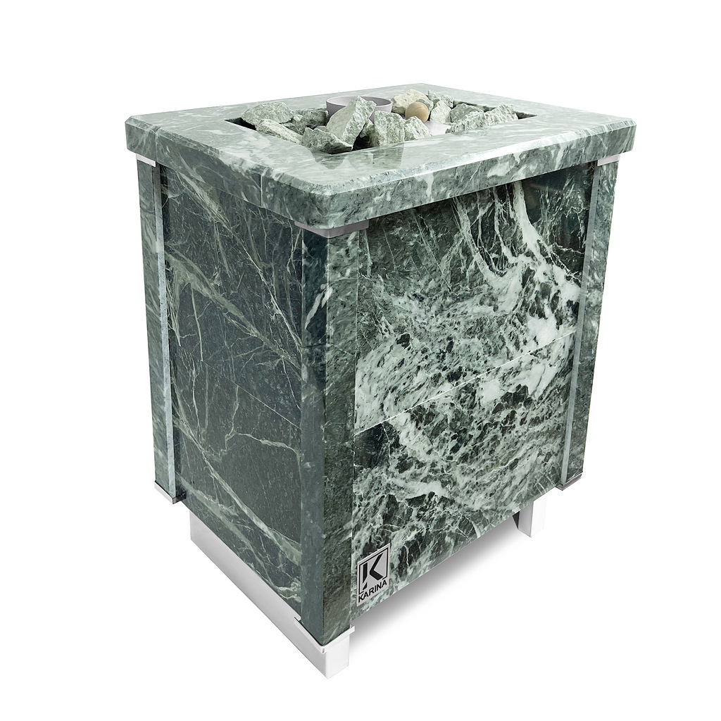Электрическая печь KARINA Quadro 9 mini Змеевик представляет собой электрокаменку, полностью облицованную натуральным камнем, и способной прогреть семейные бани и сауны объемом до 14 м3.