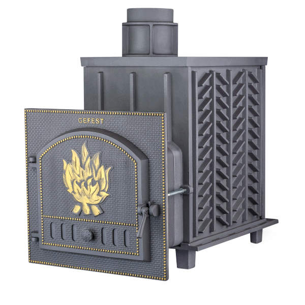 Гефест ЗК 45 - печь с усиленной каменкой большей массы, с единым углублением внутрь топки для дополнительной укладки чугунного заряда. Теплосъемные шипы, со стороны горения пламени, в разы увеличивают площадь соприкосновения огня с каменкой и ускоряют передачу тепла, а также способствуют лучшему дожигу смешивая потоки пламени и воздуха поступаемого из воздушника. Эти усовершенствования значительно повышают мощность парообразования печи и выдают большее количество пара при непрерывной подаче воды. Каменка печей Гефест-ЗК является незаливаемой.