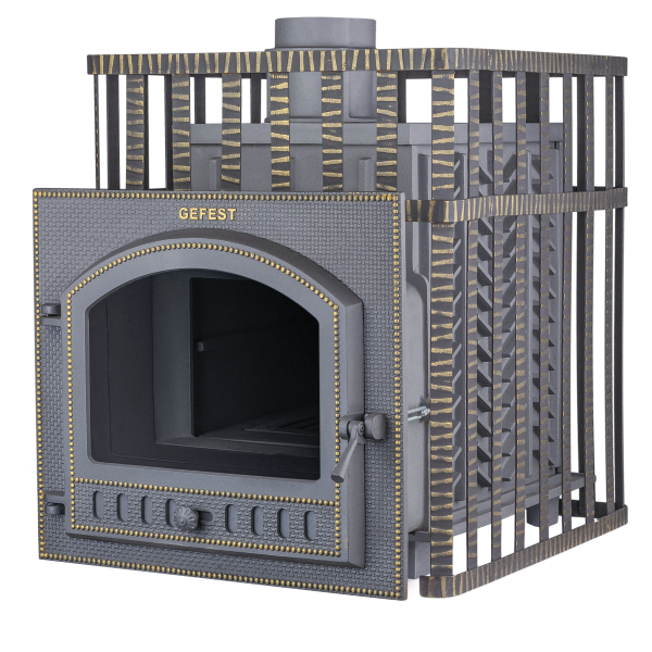 Гефест ЗК в сетке 40(П) - печь с усиленной каменкой большей массы, с единым углублением внутрь топки для дополнительной укладки чугунного заряда. Теплосъемные шипы, со стороны горения пламени, в разы увеличивают площадь соприкосновения огня с каменкой и ускоряют передачу тепла, а также способствуют лучшему дожигу смешивая потоки пламени и воздуха поступаемого из воздушника. Эти усовершенствования значительно повышают мощность парообразования печи и выдают большее количество пара при непрерывной подаче воды. Каменка печей Гефест-ЗК является незаливаемой.