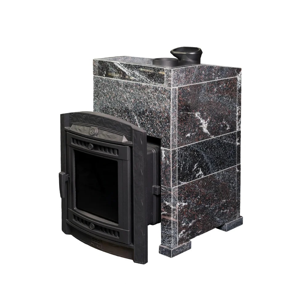 Модель печи в стильной и практичной облицовке из «Амфиболит». За счет использования несущих брусков, состоящих из цельного камня, теплоёмкость печи увеличивается на 50%. Конструкция просто собирается и позволяет легко заменить любую деталь в случае необходимости. Цена и КПД такой облицовки отличаются оптимальным соотношением.