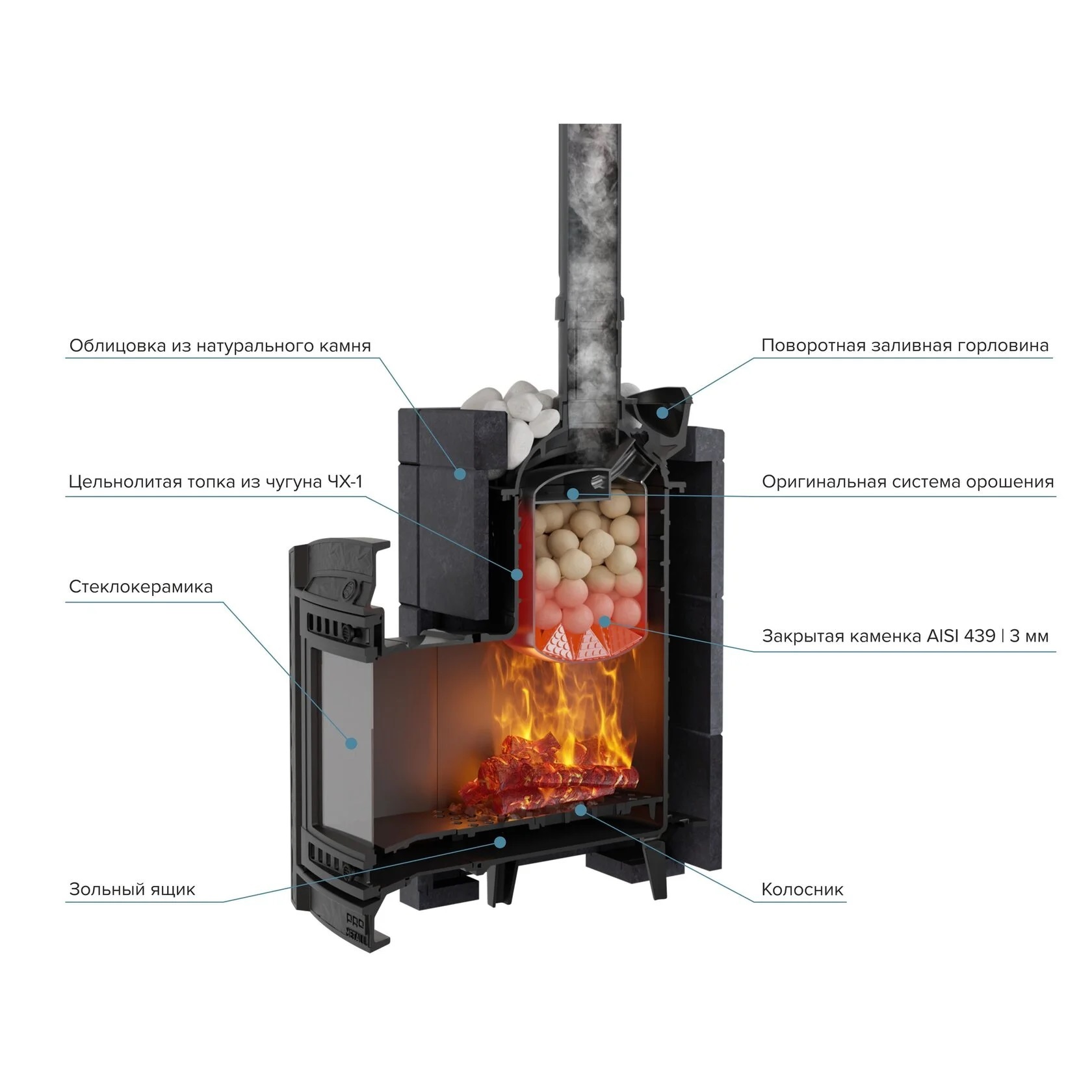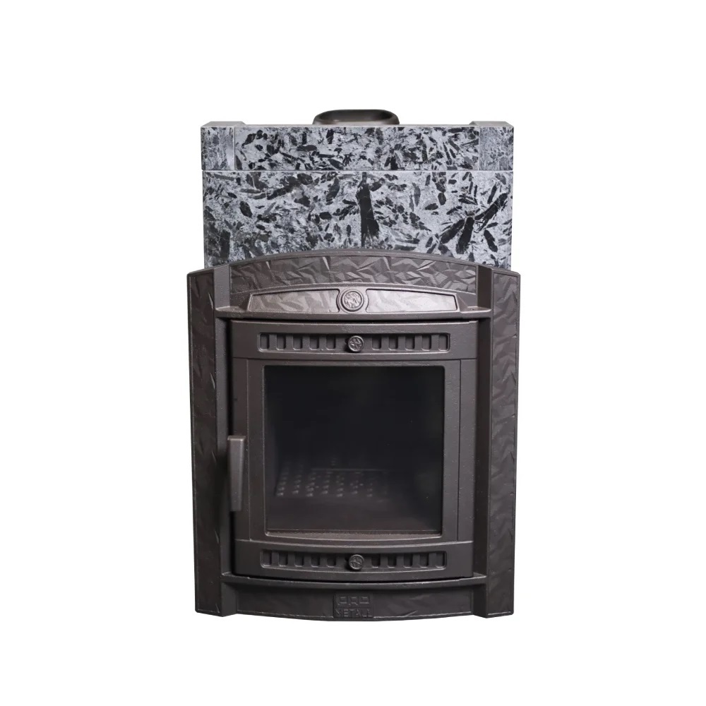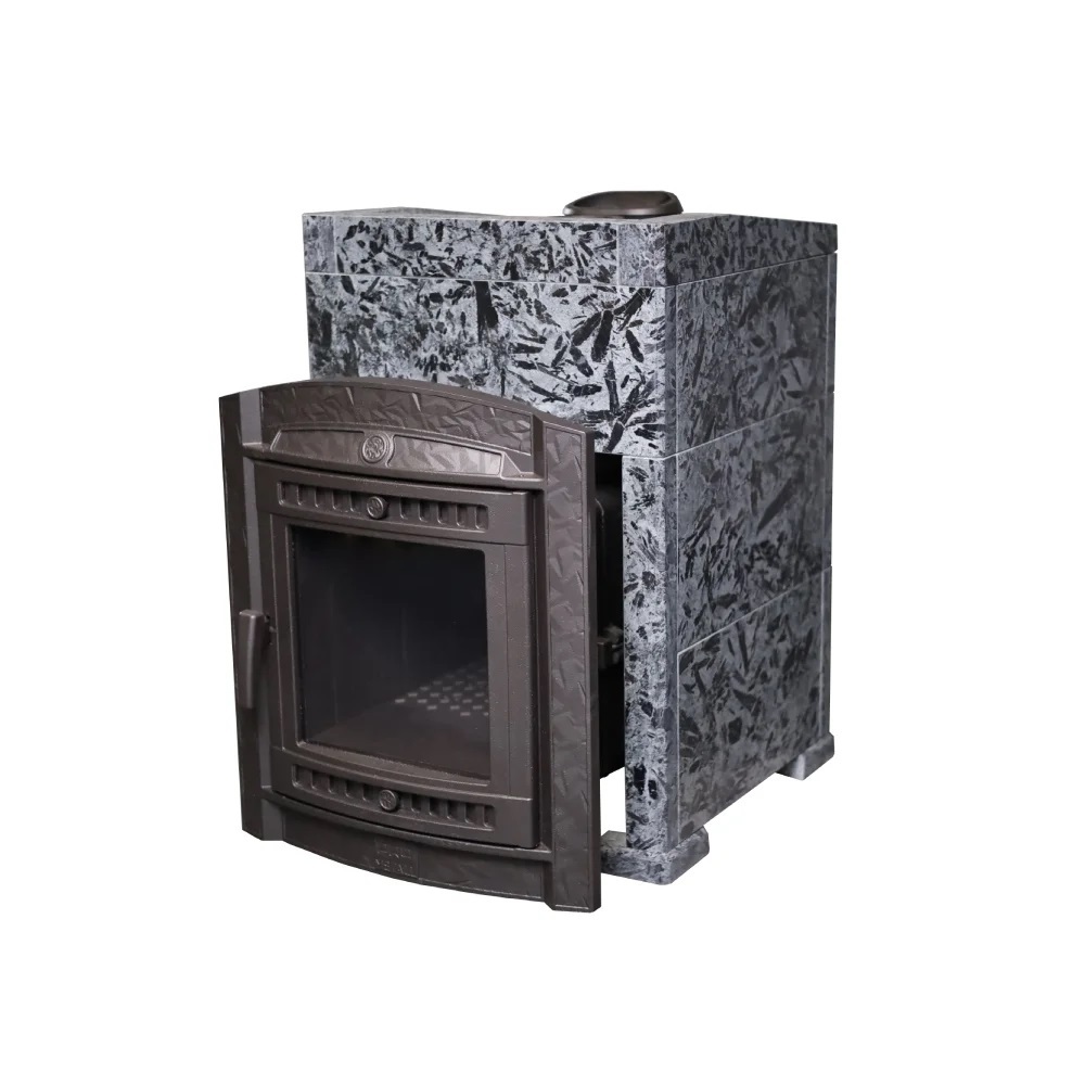 Модель печи в стильной и практичной облицовке из «Пироксенит ЭЛИТ». За счет использования несущих брусков, состоящих из цельного камня, теплоёмкость печи увеличивается на 50%. Конструкция просто собирается и позволяет легко заменить любую деталь в случае необходимости. Цена и КПД такой облицовки отличаются оптимальным соотношением.