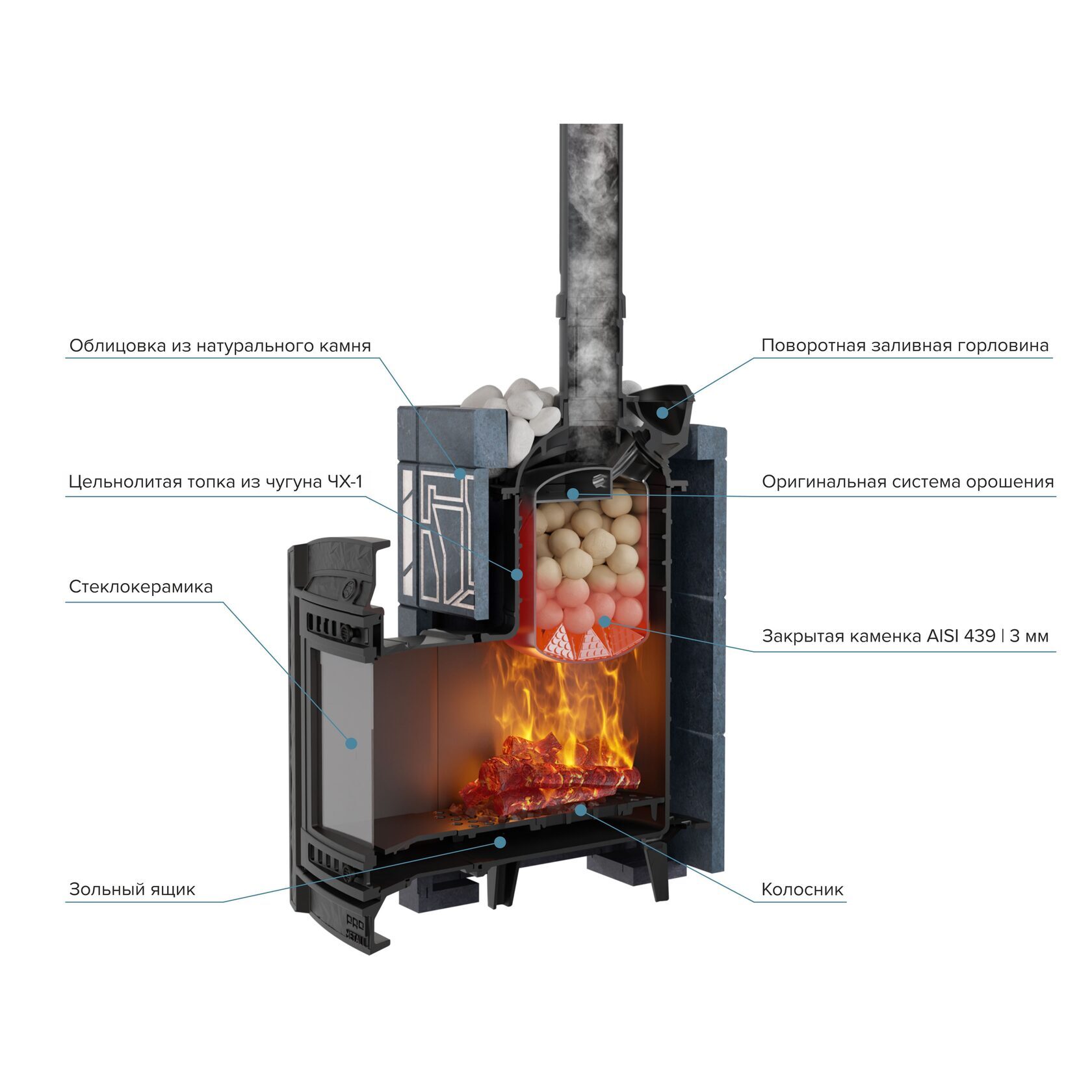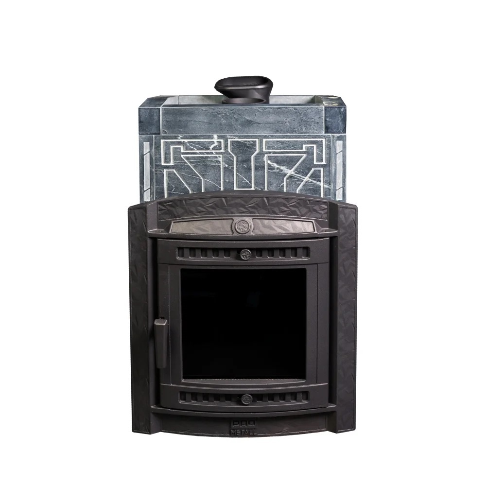 Модель печи в стильной и практичной облицовке из «Талькохлорита» узор №7. За счет использования несущих брусков, состоящих из цельного камня, теплоёмкость печи увеличивается на 50%. Конструкция просто собирается и позволяет легко заменить любую деталь в случае необходимости. Цена и КПД такой облицовки отличаются оптимальным соотношением.
