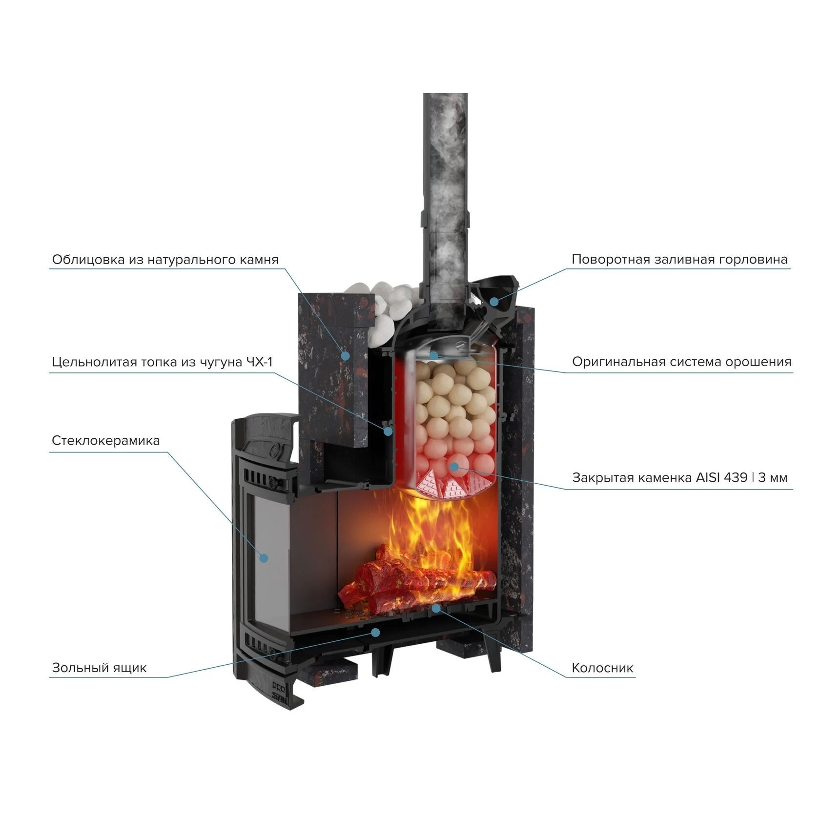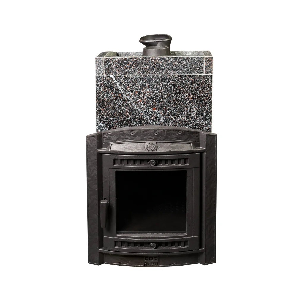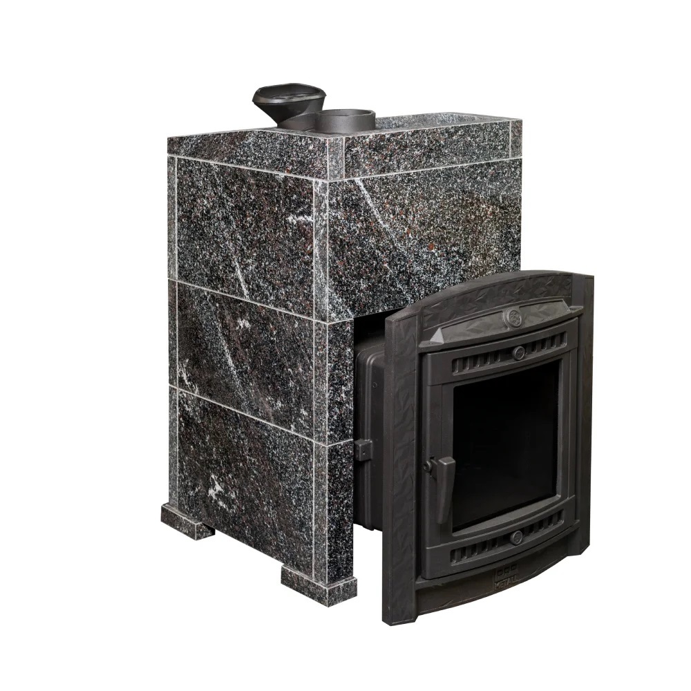 Модель печи в стильной и практичной облицовке из «Амфиболит». За счет использования несущих брусков, состоящих из цельного камня, теплоёмкость печи увеличивается на 50%. Конструкция просто собирается и позволяет легко заменить любую деталь в случае необходимости. Цена и КПД такой облицовки отличаются оптимальным соотношением.