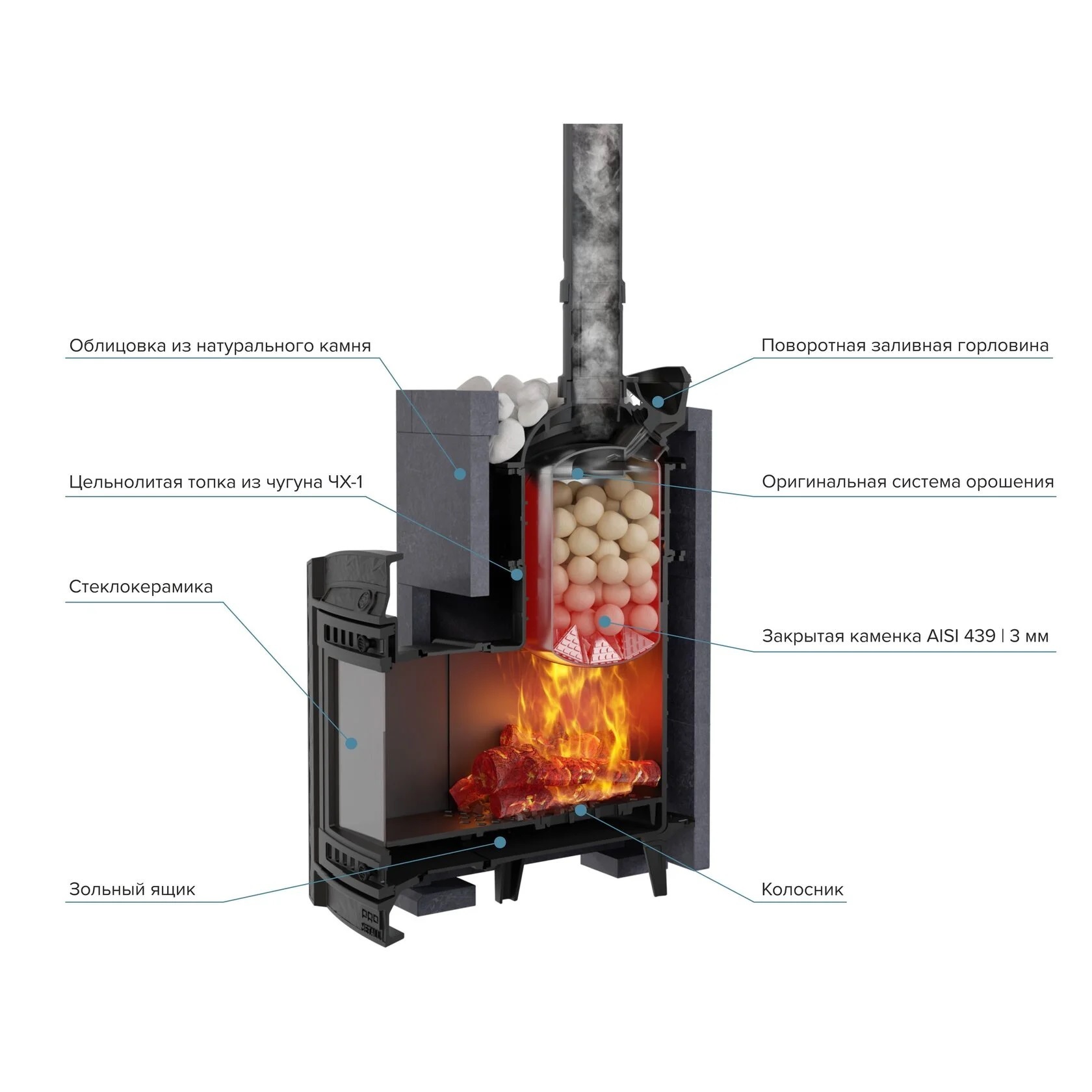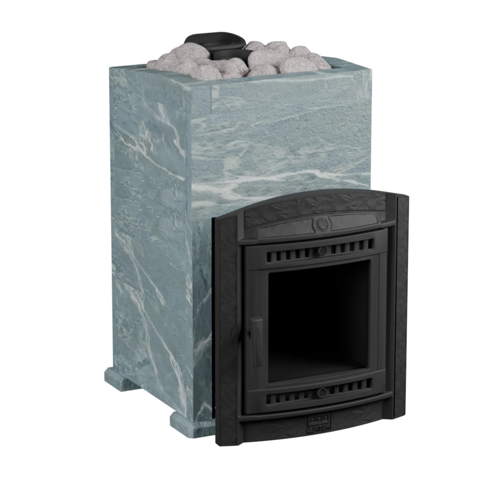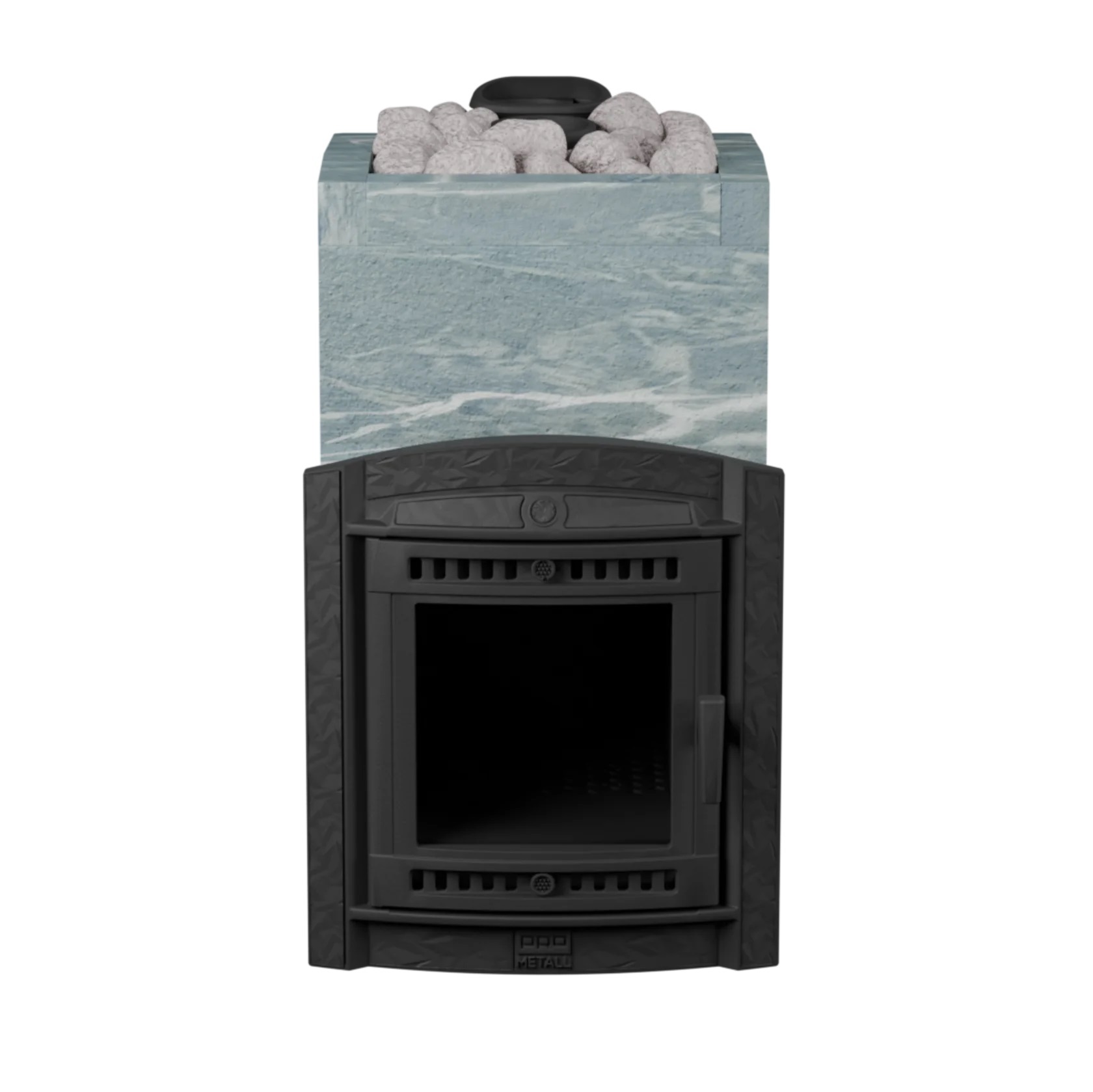 Модель печи в стильной и практичной облицовке из «Талькохлорита». За счет использования несущих брусков, состоящих из цельного камня, теплоёмкость печи увеличивается на 50%. Конструкция просто собирается и позволяет легко заменить любую деталь в случае необходимости. Цена и КПД такой облицовки отличаются оптимальным соотношением.
