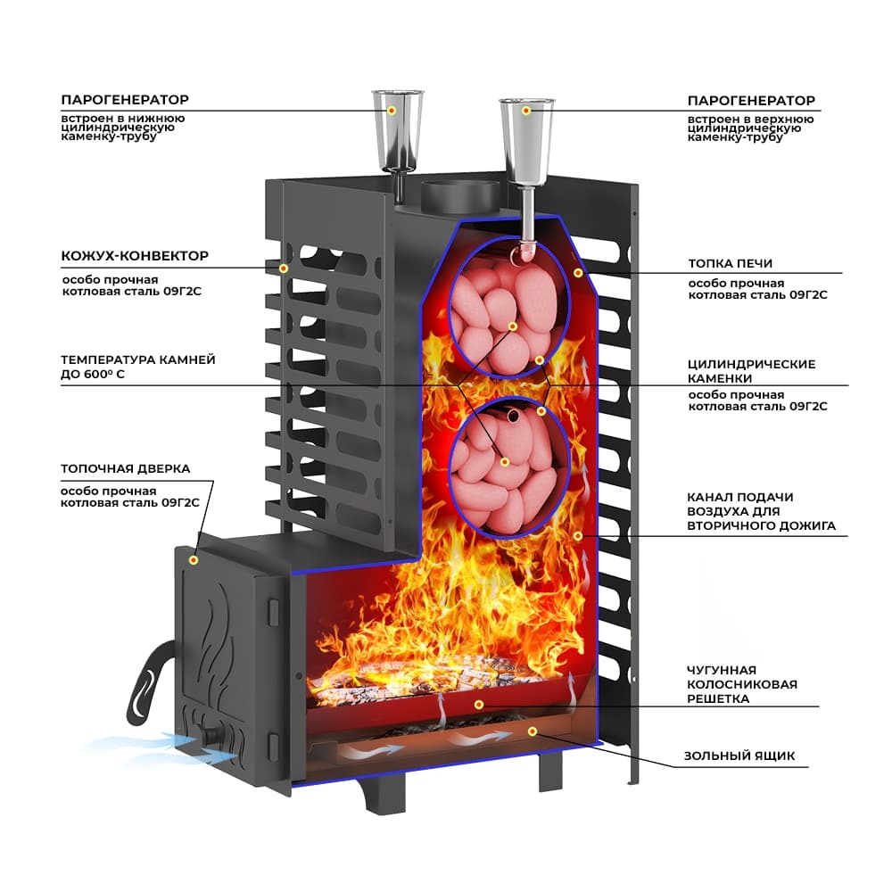 - Глубокая невентилируемая каменка-труба из стали 09Г2С толщиной 4 мм прогревается открытым пламенем для максимального нагрева камней, заложенных в нее и выполняет роль пламегасителя.