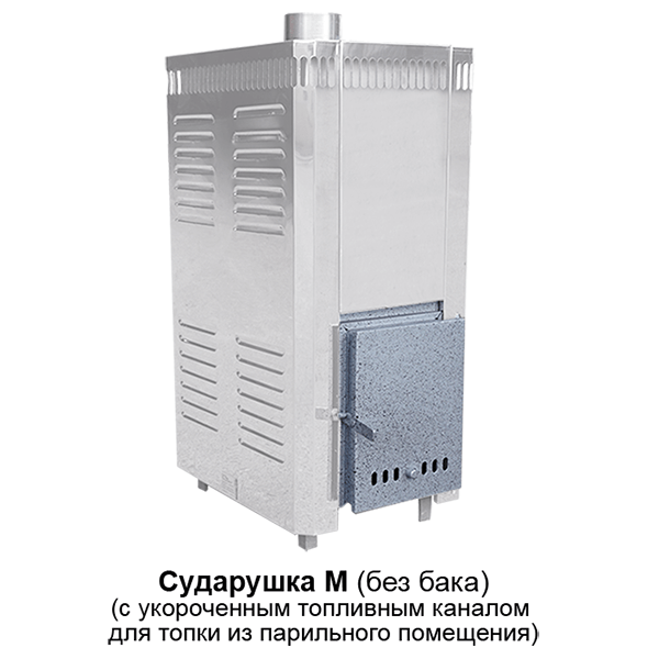 Каменка в двух вариантах – горячекатаная или нержавеющая сталь AISI 439. Модульность элементов печи позволяет собирать её как влево, так и в правостороннем исполнении по выбросу пара. «Сударушка М» удобна тем, что её топка осуществляется из смежного помещения с использованием топочного тоннеля, оборудованного дверкой с панорамным стеклом, позволяющим любоваться пламенем и контролировать процесс горения. Рассекатель пламени, усиливающий дно каменки, значительно продлевает срок службы печи.