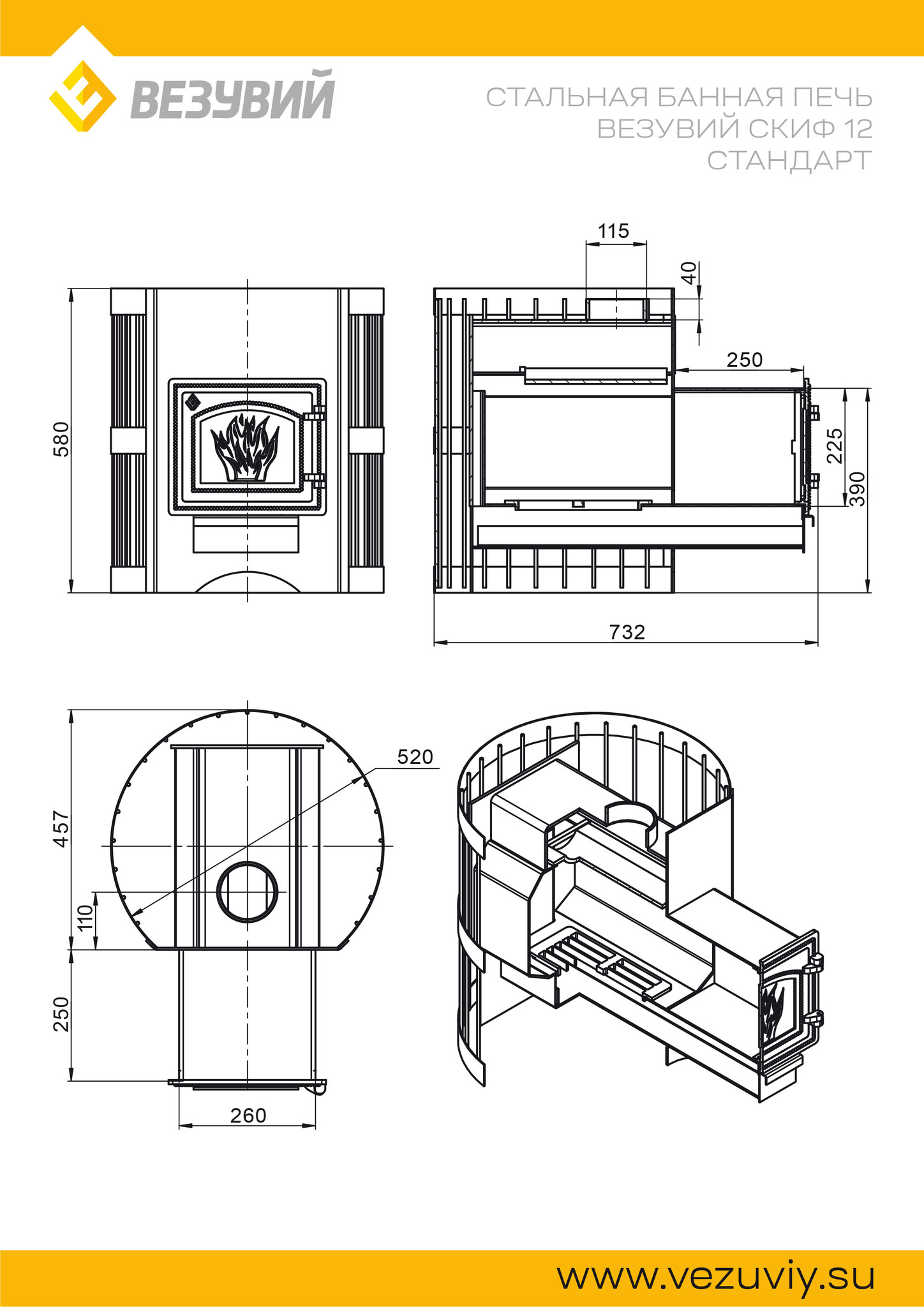 Стальная банная печь ВЕЗУВИЙ Скиф 12 (ДТ-3) Стандарт предназначена для прогрева парного помещения в бане и поддержания необходимой температуры во время парения. Печь СКИФ оборудована открытой каменкой, закладываемой камнями для бани (приобретаются отдельно). Печь изготовлена из особо прочной котловой стали 09Г2С, рассчитанной на работу при высоких температурах и давлении. Толщина стенок печи 4-6 мм. Топочный тоннель также выполнен из стали марки 09Г2С толщиной 4 мм, что позволяет топить дрова длиной более 50 см. Топка оснащена каналом для подачи воздуха на вторичный дожиг дымовых газов. Канал проходит по задней стенке топки снизу вверх и подаёт воздух для горения в верхние отделы топки. Такая конструкция повышает экономичность печи и увеличивает КПД агрегата.