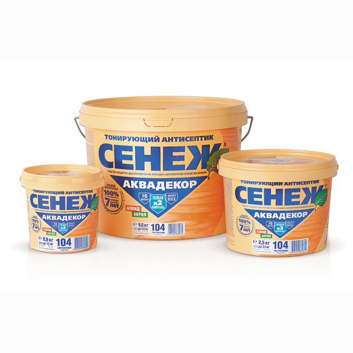 Антисептик СЕНЕЖ АКВАДЕКОР предназначен для долговременной защиты древесины от атмосферных осадков, плесневых, деревоокрашивающих и дереворазрушающих грибов, водорослей и насекомых-древоточцев, а также декоративной отделки под ценные породы. Сочетание в СЕНЕЖ АКВАДЕКОР алкидов, акрилатов и льняного масла улучшает проникновение в древесину, формирует эластичное дышащее защитное покрытие с мягким шелковистым блеском.